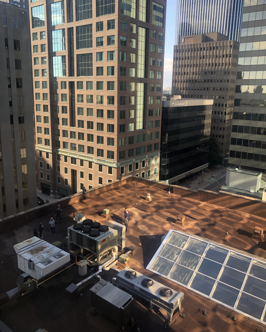 Surrounding them, tall buildings of brick, glass, and dark metal reflect the blue sky and white clouds of the day. Shadows stretch across the rooftop.